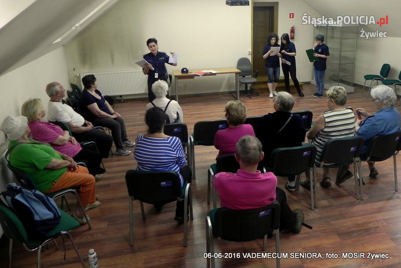 Żywieccy policjanci biorą udział w zorganizowanym przez MOSiR projekcie "Senior/ka". W ramach tej inicjatywy osobom starszym przekazywane są ważne dla nich treści z zakresu różnych dziedzin – od bezpieczeństwa po zdrowy styl i tryb życia. W tym tygodniu odbyło się kolejne spotkanie. Tematem były oszustwa. Stróże prawa wspólnie z uczniami klasy policyjnej ZSME w Żywcu przygotowali występ, w czasie którego młodzi ludzie przedstawili seniorom sposób działania oszustów posługujących się tzw. metodą na wnuczka. Przekazali również cenne treści dotyczące tego, jak uniknąć takich sytuacji i co robić, kiedy już się zdarzą. Spotkanie miało charakter interaktywny i w czasie jego trwania, seniorzy dzielili się zarówno swoimi doświadczeniami, jak i doświadczeniami znajomych, czy bliskich. Aby seniorzy mogli efektywniej wykorzystać przekazaną im wiedzę wydział prewencji żywieckiej komendy policji opracował specjalną broszurę - „Vademecum Seniora”. Książeczka została podzielona na części tematyczne, dzięki czemu, uczestnicy projektu otrzymają w pigułce cenne porady i informacje z zakresu szeroko rozumianego bezpieczeństwa przydatne im w życiu codziennym. Wkrótce kolejne spotkanie.