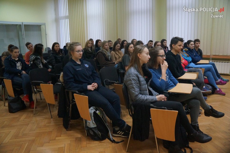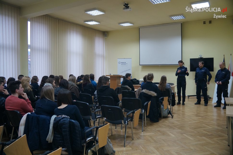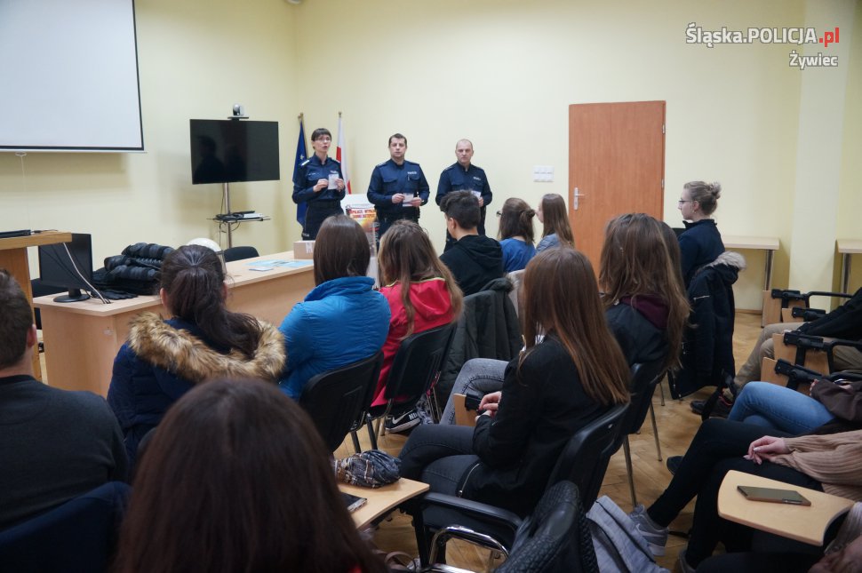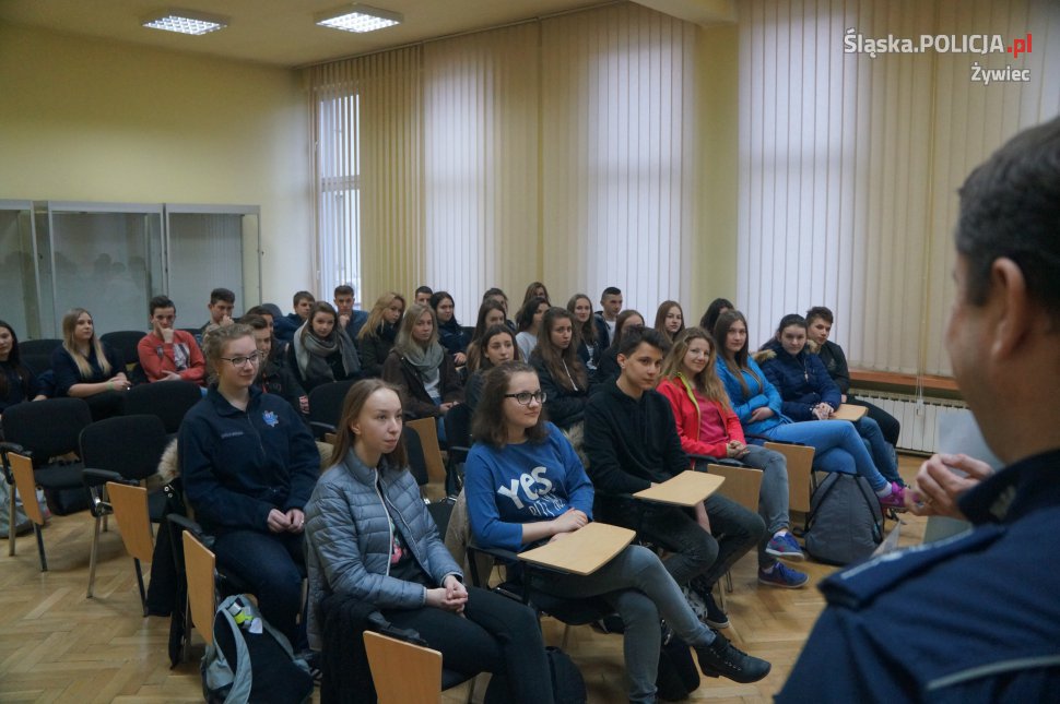 Dzisiaj uczniowie z klasy policyjnej Zespołu Szkół Mechaniczno-Elektrycznych w Żywcu odwiedzili żywieckich stróżów prawa. W czasie spotkania dzielnicowi przedstawili im ideę działania aplikacji mobilnej „Moja Komenda”. Omawiali oraz prezentowali, jak łatwo dzięki niej można znaleźć dzielnicowego z danego terenu i skontaktować się z nim telefonicznie lub też za pomocą poczty elektronicznej. Z kolei będąc w podróży, czy na wycieczce, w razie potrzeby można szybko ustalić, gdzie jest najbliższa jednostka policji i jak w najprostszy sposób można się do niej dostać. W czasie spotkania dzielnicowi omówili również sposób działania "Krajowej Mapy Zagrożeń Bezpieczeństwa" i zachęcali młodzież do reagowania na zagrożenia pojawiające się w ich okolicy. Mundurowi chętnie odpowiadali na zadawane przez uczniów pytania. Pod koniec spotkania, w czasie dyskusji, młodzi ludzie, wiążący swoją przyszłość z mundurem podkreślali, że bardzo ważne jest mieć wpływ na bezpieczeństwo i móc je kreować.