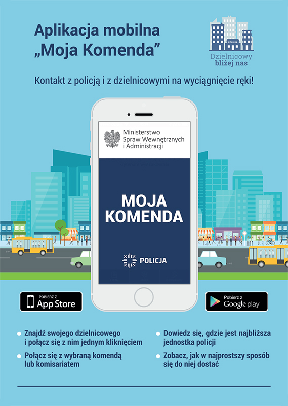 Policjanci, wychodząc także naprzeciw użytkownikom mediów komórkowych, proponują szybkie i proste w obsłudze rozwiązanie jakim jest aplikacja „Moja Komenda” dzięki której każdy bez problemu odnajdzie najbliższą jednostkę policji oraz swojego dzielnicowego z jego numerem telefonu. Jest ona bardzo łatwa w obsłudze. Pozwala jednym kliknięciem ustalić kontakt do swojego dzielnicowego. Wystarczy wpisać adres, aby sprawdzić, który policjant odpowiada za dany rewir. Dzielnicowych możemy wyszukać także po ich imieniu i nazwisku. Aby połączyć się z funkcjonariuszem wystarczy jedno kliknięcie.