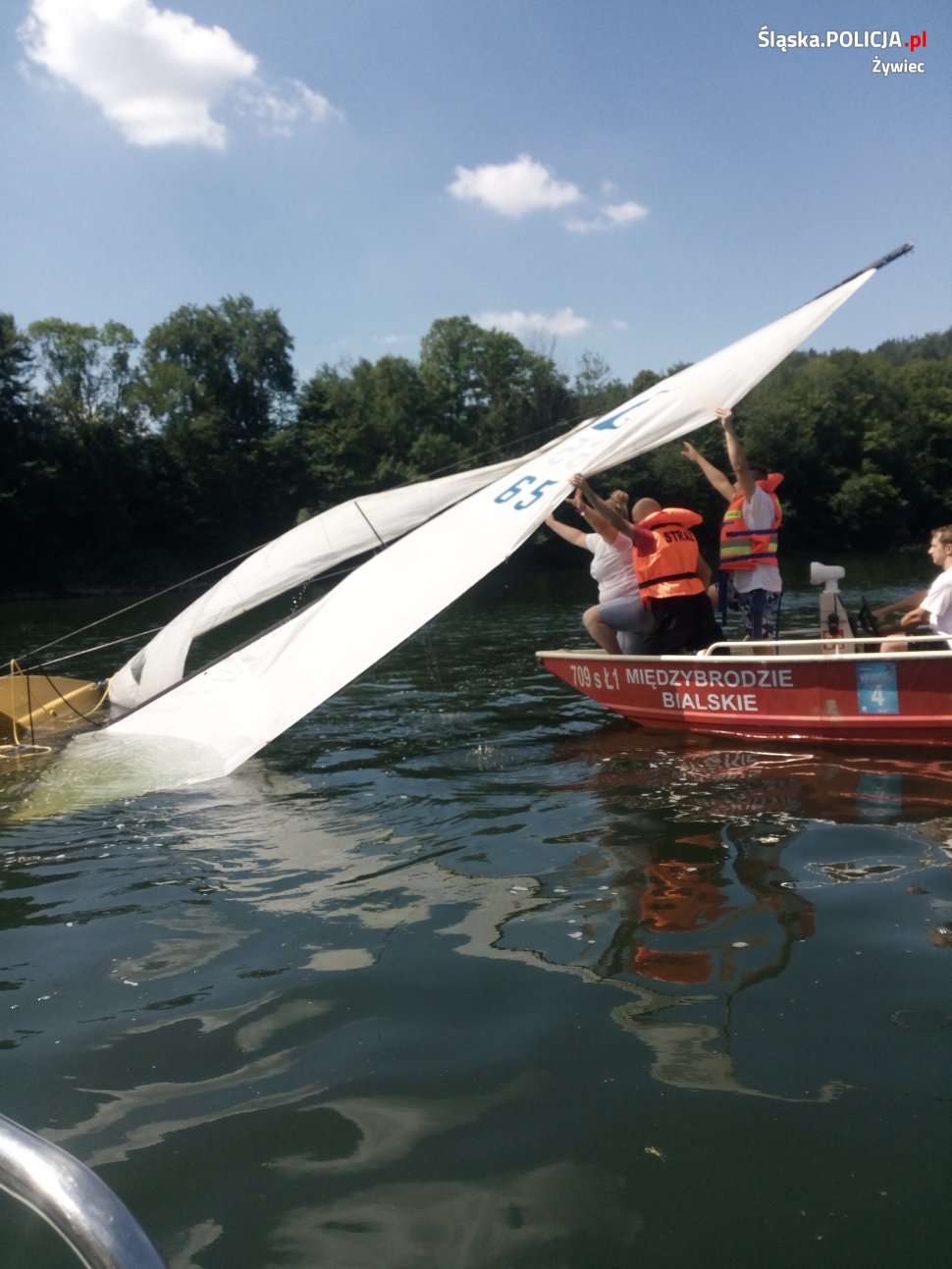 Do zdarzenia doszło wczoraj przed południem na Jeziorze Międzybrodzkim. Pełniący tam służbę policjanci z sezonowego ogniwa wodnego z Gilowic, otrzymali informację o przewróconej żaglówce. Natychmiast popłynęli we wskazany rejon jeziora. Gdy zbliżali się do dryfującej łodzi zauważyli, że w wodzie znajduje się kobieta i mężczyzna. Nie mieli oni założonych kamizelek ratunkowych. Policjanci podjęli ich z wody. Na szczęście nic im się nie stało. Następnie, wspólnie ze strażakami z Żywca oraz strażakami ochotnikami z Międzybrodzia Bialskiego, rozpoczęli akcję związaną z postawieniem ich łódki. Po jej zakończeniu żeglarzy i ich sprzęt przetransportowano na suchy ląd.