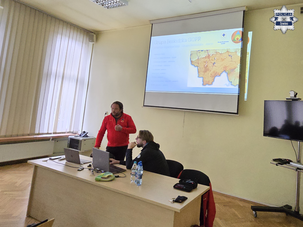 Szkolenia policjantów odbywają się systematycznie, aby mogli oni wykonywać swoje obowiązki służbowe na jak najwyższym poziomie. Tematyką wczorajszego szkolenia była współpraca policjantów oraz ratowników górskich w działaniach poszukiwawczych. Ratownicy opowiedzieli o strukturach organizacyjnych swojej jednostki oraz o sprzęcie jakim dysponują. Kolejno poruszono temat poszukiwań osób oraz wspólnej obsługi zdarzeń w rejonach górskich. Przedstawiono różne metody poszukiwawcze z podziałem na zadania dla poszczególnych służb. Na koniec omówiono i przeanalizowano niektóre z minionych akcji poszukiwawczych. W szkoleniu uczestniczyli mundurowi z Komendy Powiatowej Policji w Żywcu oraz podległych komisariatów.
