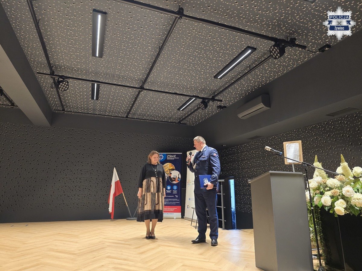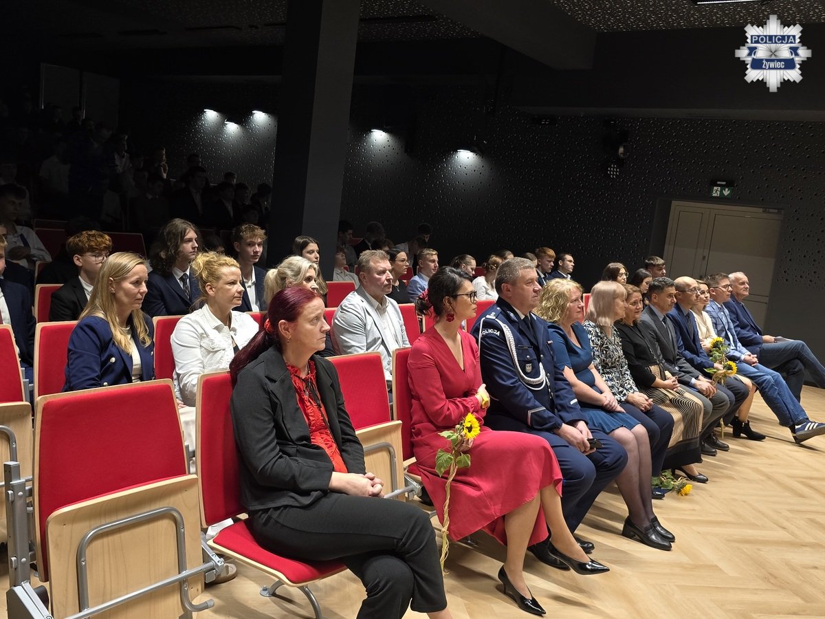 W imieniu Komendy Powiatowej Policji w Żywcu, po krótkim przemówieniu młodszy inspektor Jerzy Bujok, na ręce dyrektor szkoły - Bożeny Piątek złożył list gratulacyjny, w którym kierownictwo naszej jednostki pogratulowało uczniom podjęcia decyzji o nauce w klasach mundurowych i zachęciło do dalszego rozwijania pasji związanej ze służbą w formacjach odpowiedzialnych za bezpieczeństwo. Nauczycielom zaś i pracownikom oświaty złożył najserdeczniejsze podziękowania i wyrazy uznania za trud, poświecenie oraz codzienną pracę na rzecz młodego pokolenia.