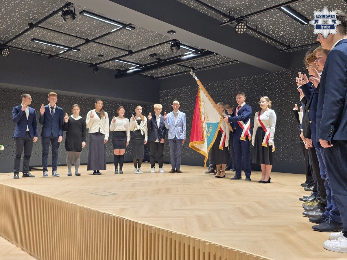 W uroczystości udział wziął między innymi I Zastępca Komendanta Powiatowego Policji w Żywcu, młodszy inspektor Jerzy Bujok. Ceremonia rozpoczęła się od wprowadzenia pocztu sztandarowego oraz odśpiewania hymnu państwowego. Następnie uczniowie klas pierwszych złożyli uroczystą rotę ślubowania, zobowiązując się do przestrzegania zasad etyki, godnego reprezentowania szkoły oraz służb, których tradycje poznają w trakcie nauki.