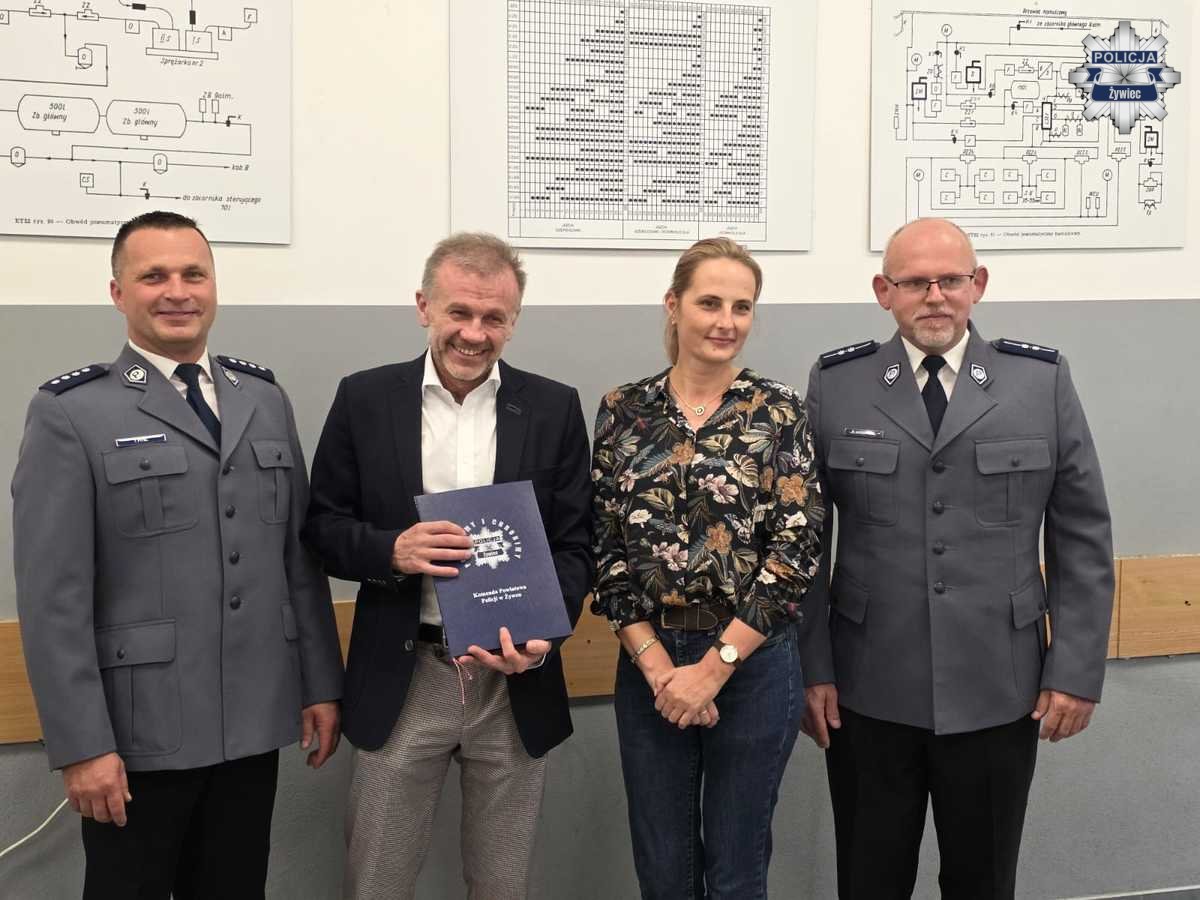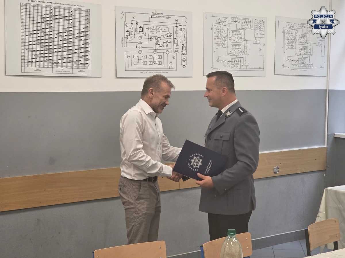 Przedstawiciele Komendy Powiatowej Policji w Żywcu, z okazji minionego święta Komisji Edukacji Narodowej przekazali list gratulacyjny Dyrektorowi Zespołu Szkół w Żywcu, Zakładu Doskonalenia Zawodowego Panu magistrowi Maciejowi Moc. Szkoła w której funkcjonują oddziały o profilu mundurowym ściśle współpracuje z tutejsza jednostką policji.