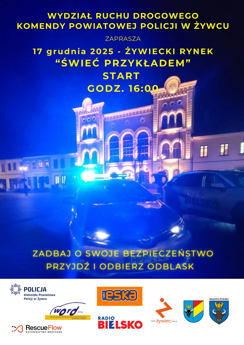 Komenda Powiatowa Policji w Żywcu, Miasto Żywiec, Wojewódzki Ośrodek Ruchu Drogowego w Bielsku-Białej, grupa medyczna Rescue Flow, Radio Bielsko oraz portal Żywiecinfo serdecznie zapraszają do wzięcia udziału w akcji profilaktycznej, która odbędzie się na Rynku w Żywcu już jutro od godziny 16:00. Będą konkursy z nagrodami oraz niespodzianki.