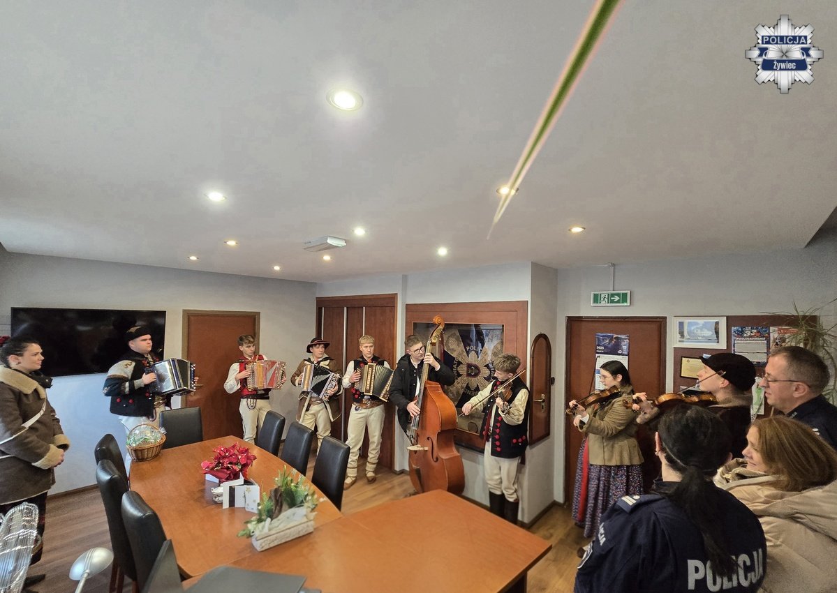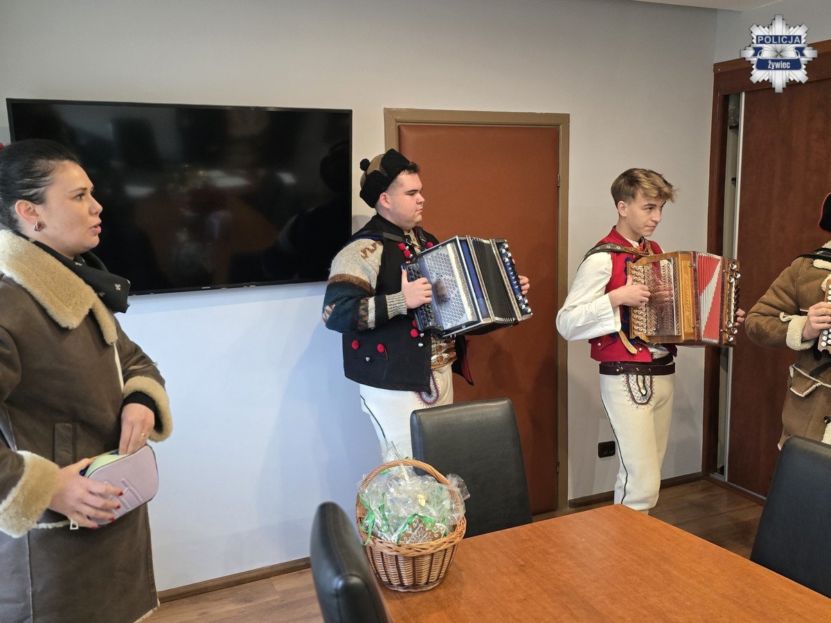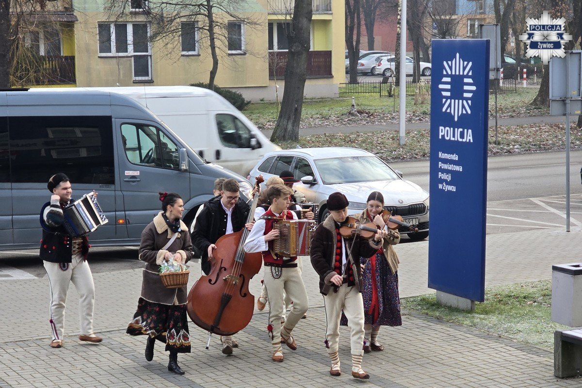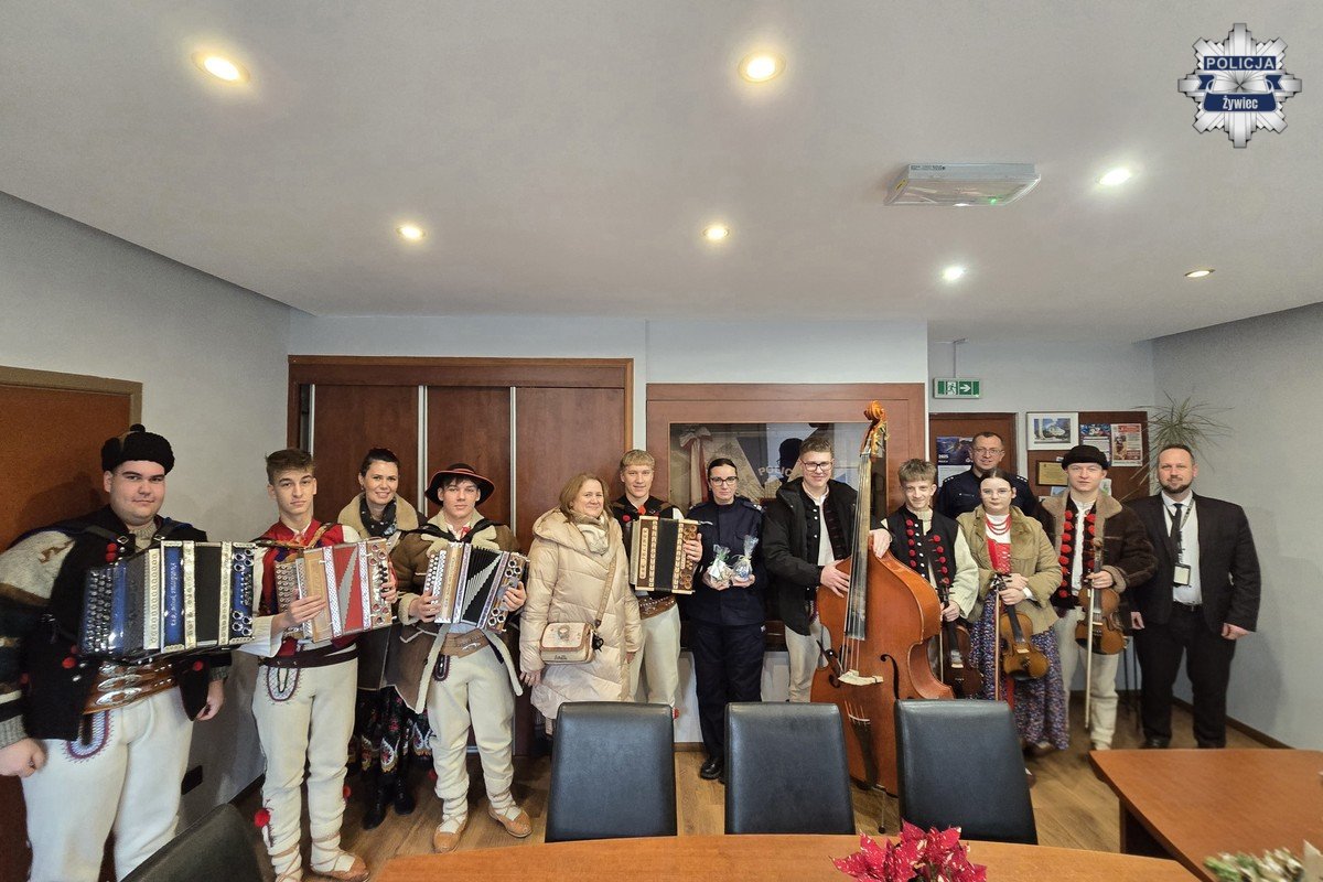 Kolędnicy, ubrani w tradycyjne góralskie stroje zaprezentowali pastorałki, wprowadzając wszystkich w radosny, bożonarodzeniowy nastrój. Młodzież złożyła także policjantom serdeczne, świąteczne życzenia, które spotkały się z bardzo ciepłym przyjęciem.