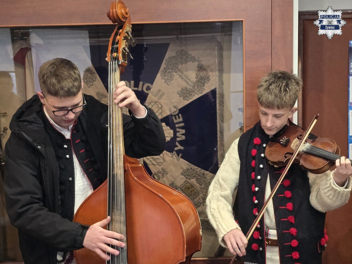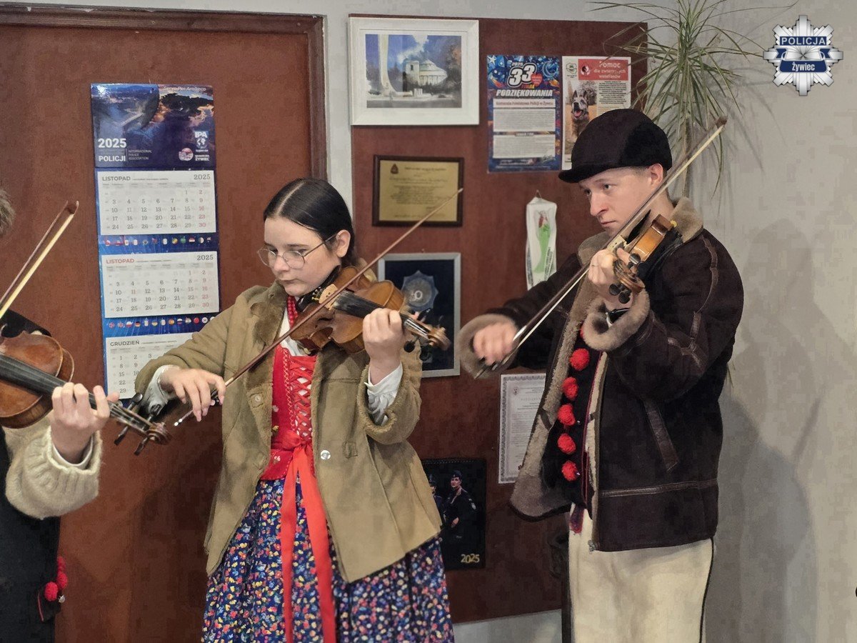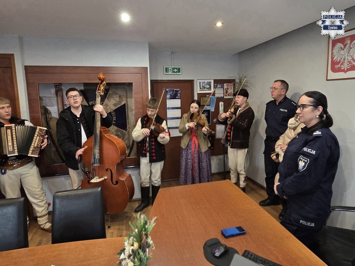 Kolędnicy, ubrani w tradycyjne góralskie stroje zaprezentowali pastorałki, wprowadzając wszystkich w radosny, bożonarodzeniowy nastrój. Młodzież złożyła także policjantom serdeczne, świąteczne życzenia, które spotkały się z bardzo ciepłym przyjęciem.