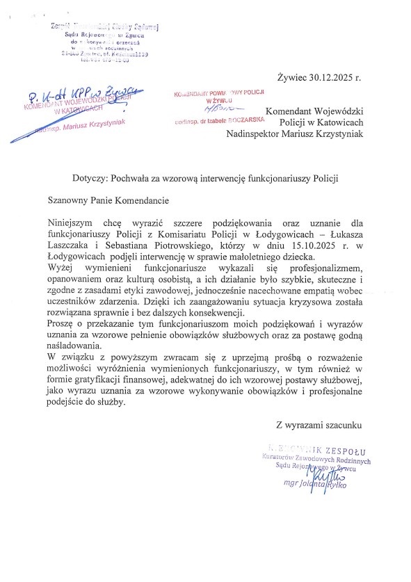 Do Komendy Powiatowej Policji w Żywcu wpłynęły adresowane do Komendanta Wojewódzkiego Policji w Katowicach podziękowania od Kierownika Zespołu Kuratorów Zawodowych Rodzinnych Sądu Rejonowego w Żywcu za profesjonalną i wzorową interwencję funkcjonariuszy z Komisariatu Policji w Łodygowicach.