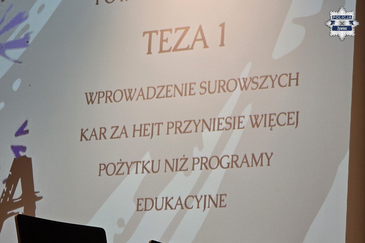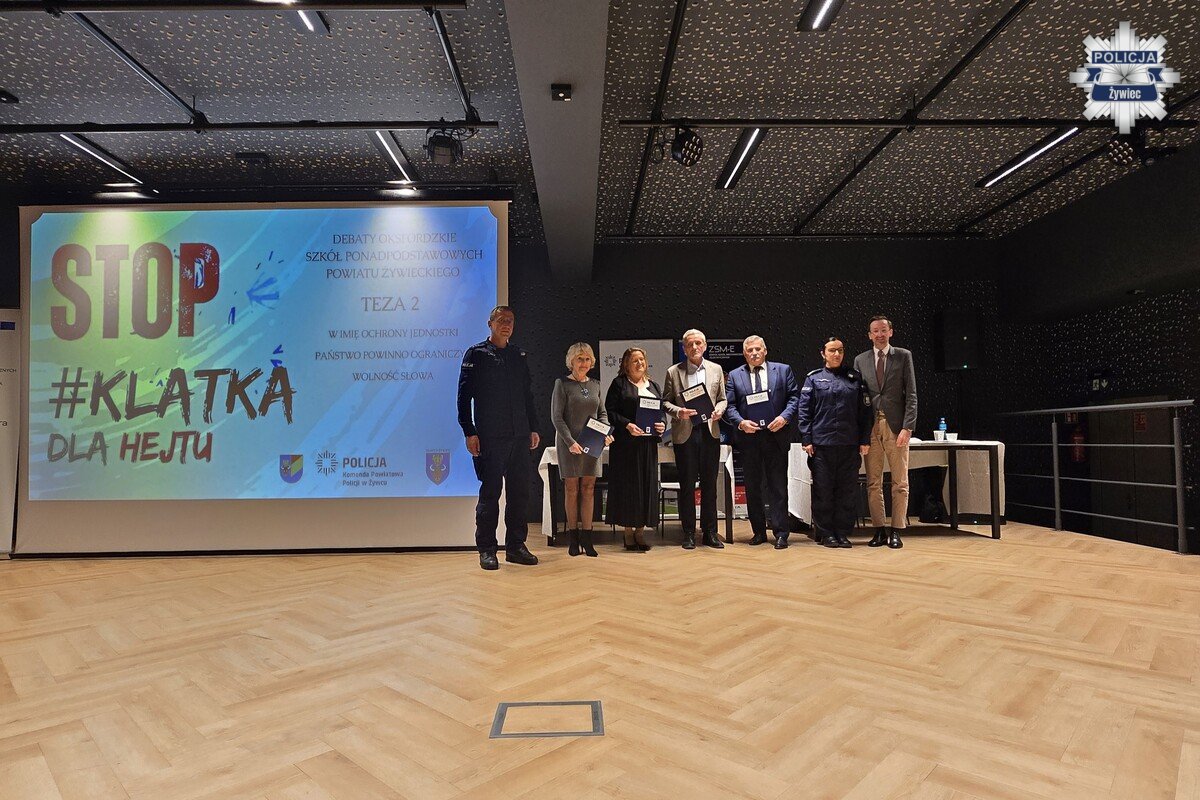 Komenda Powiatowa Policji w Żywcu zorganizowała debatę oksfordzką pod hasłem „STOP - KLATKA DLA HEJTU - CUT THE HATE!”, poświęconą problemowi hejtu, mowy nienawiści oraz ich wpływowi na zdrowie psychiczne i życie młodych ludzi. Wydarzenie odbyło się 19 marca 2026 roku i zgromadziło przedstawicieli samorządu, ekspertów, dyrektorów szkół, nauczycieli oraz młodzież z terenu Żywiecczyzny.